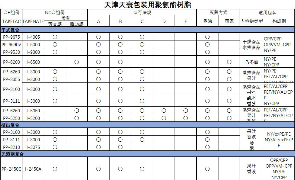 三井化学聚氨酯复合胶,商品名称Takelac/Takenate。可应用于食品包装(一般用途到高温蒸煮)、日化包装、建材包装、装饰膜、医药包装、农药包装、复膜铁、工业包装、高阻隔包装等
