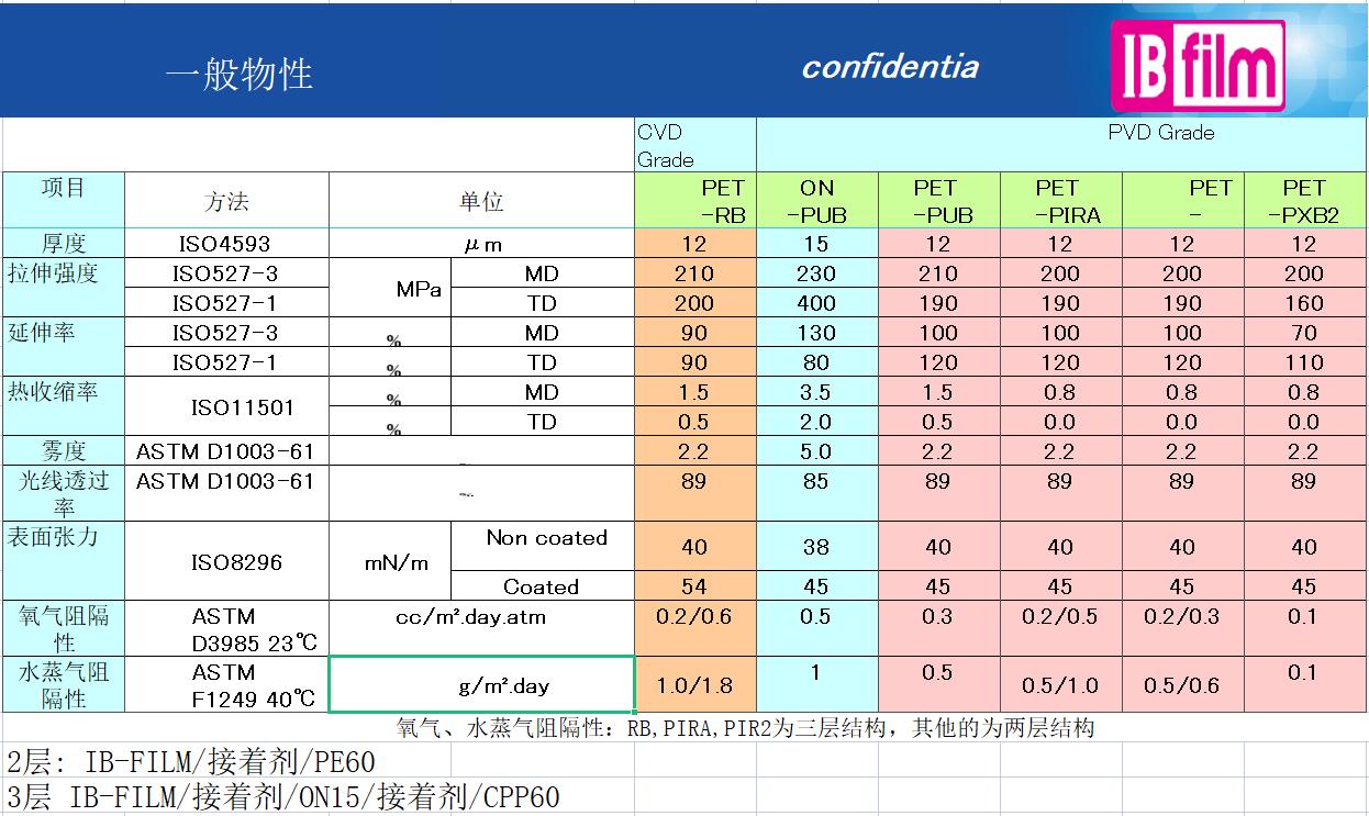 DNP高阻隔性薄膜,商品名IB Film ,包括PET氧化铝高阻隔薄膜系列,氧化硅高阻隔薄膜系列,其表面有特殊涂层处理,有优越的阻氧性能,优越的阻水性能 ,易印刷性能。可应用于食品包装行业,化妆品行业,药品包装行业。